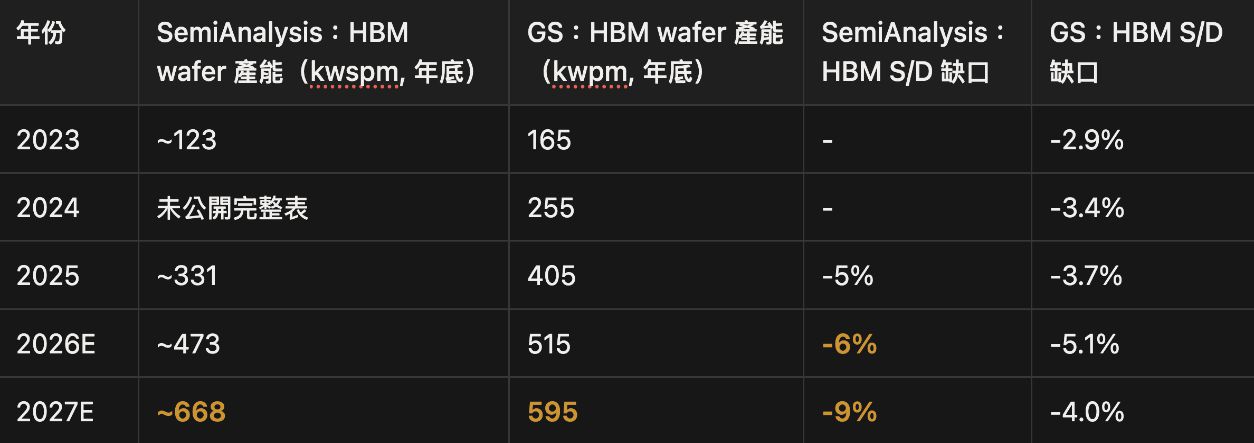 理由一:Wafer Penalty 導致產能擴張的速度,遠不如表面上看起來那麼快 三星、SK Hynix、美光這三家記憶體大廠確實都在大舉擴產。但有一個關鍵細節市場往往忽略:生產 AI 專用記憶體(HBM),消耗的晶圓數量是生產普通記憶體的三到四倍,因為製程極為複雜,良率也比普通記憶體低得多。 打個比方,同樣蓋一棟樓,AI 記憶體需要的工人、材料和時間是一般住宅的四倍。所以就算廠商宣布「擴大產能」,實際上能多生產出來的 AI 記憶體,遠比帳面數字少得多。根據獨立研究機構 Semianalysis 的估算,AI 記憶體的供需缺口不會因為擴產而縮小,2027 年反而會比 2026 年更大。