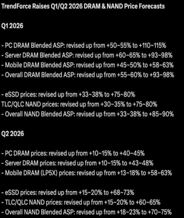現貨價格下滑,但合約價格持續上升,顯示現貨價格和實際的合約價格正在脫鉤 儘管現貨價格下滑,但現貨市場(Spot Market)只佔整體 DRAM 交易量的 1–3%,剩下 97% 以上都是合約價(Contract Price)交易。原廠幾乎全數以合約價出貨,在現貨市場買賣的主要是交易商和轉售商——也就是對產品本身沒有附加價值、純粹買賣顆粒的人。 因此,現貨價反映的更多是這群交易商的短期情緒,而不是手機廠、PC 廠、雲端業者的真實採購動向。此外,近期 DDR4 現貨價的異常波動,有很大一部分是中國廠商囤貨所驅動,失真程度更高。看現貨價預測記憶體走勢,就像用便利商店的零售價去預測量販店的批發合約價——樣本太小、結構不同,參考意義有限。